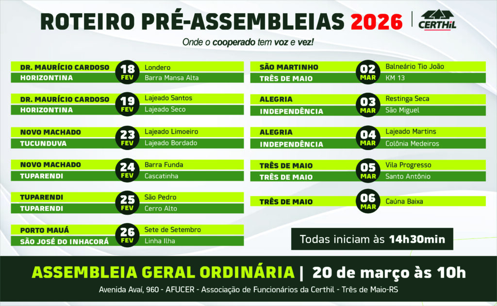 A Certhil dá início, no dia 18 de fevereiro, ao calendário de Pré-Assembleias 2026, que seguem até 6 de março, contemplando 21 localidades em 11 municípios da região noroeste. Os encontros são voltados aos cooperados e têm como objetivo fortalecer a participação, o diálogo e a transparência na gestão da cooperativa.