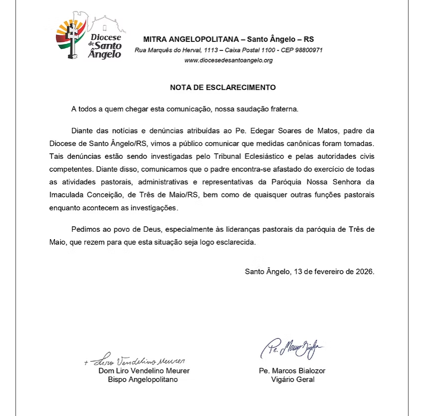 “Cautela em darmos informações, existe uma investigação Cível que compete à Polícia Civil (Três de Maio) e outra Canônica que está sendo realizada em Santa Rosa. No momento é isso. Informações diferentes disso não nos compete no momento”, diz a nota.