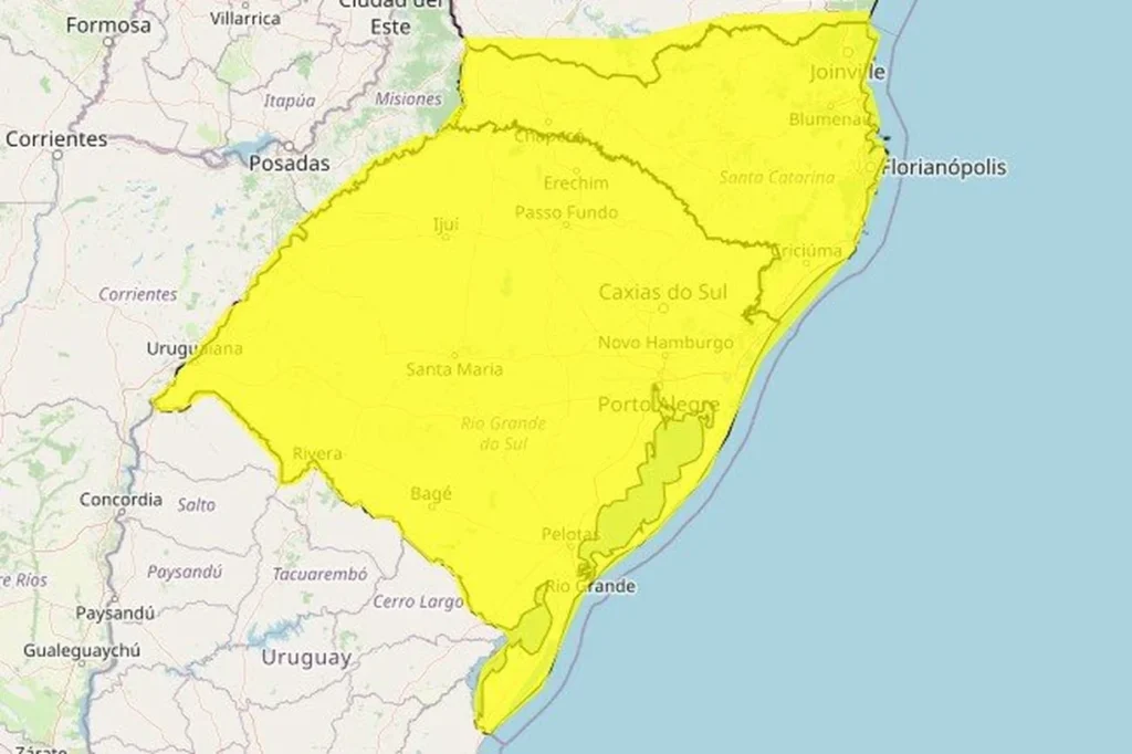Já o outro, na cor amarela, sinaliza perigo potencial de tempestade até as 10h e abrange todo o Rio Grande do Sul.
